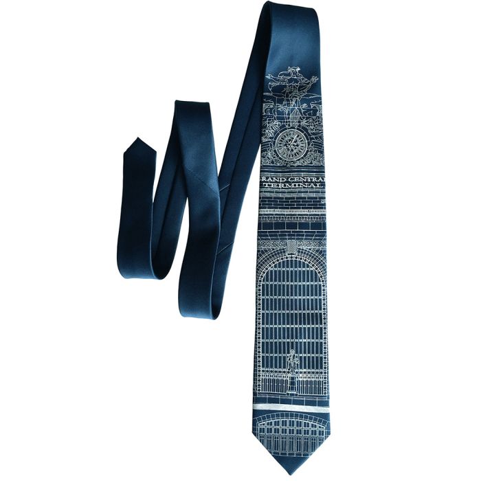 Beautiful french blue tie depicting a drawing of iconic Grand Central Terminal in New York City. A major hub for millions of people from around the world. Show off your New York style wherever you go! Perfect for newcomers, ex-pats, fans from afar and long-time New York City dwellers alike.