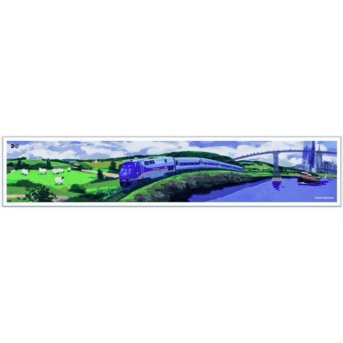 Reminding us of what lies beyond our city boundaries, illustrator James Ransome captures the allure of a train journeying north along the scenic Hudson River. In Ransome’s world, Metro-North Railroad links two scenic contrasts: the New York cityscape and the Hudson Valley landscape that lies to the north. A train makes its way past verdant hill towns and villages replete with historic mansions, churches and a rich landscape dotted with farm animals that represent the robust agriculture of the magnificent Hudson Valley.