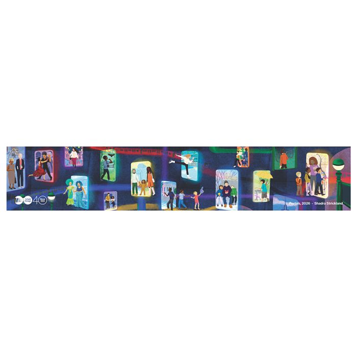 "Portals" by Shadra Strickland presents a dreamlike vision of travel through a series of vibrant, colorful doorways. Each portal suggests a subway entrance, where passengers appear to step effortlessly into destinations across New York City. Against the dark backdrop, streaks of neon light trace the motion of trains, adding energy and rhythm to the scene. Diverse characters and glimpses of iconic locations celebrate the city's boundless possibilities and the ease of exploring its wonders through mass transit.