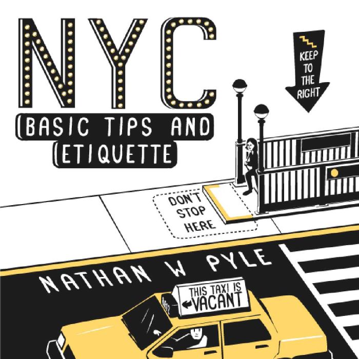 Living in New York City for five years as a transplant from Ohio, illustrator and T-shirt designer Nathan Pyle was fascinated by the unique habits and unspoken customs New Yorkers follow to make life bearable in a city with 8 million people (and seemingly twice the number of tourists). In NYC Basic Tips and Etiquette, Pyle reveals the secrets and unwritten rules for living in and visiting New York including the answers to such burning questions as, how do I hail a cab? What is a bodega? Which way is Uptown? Why are there so many doors in the sidewalk? How do I walk on an escalator? Do we need be touching right now? Where should I inhale or exhale while passing sidewalk garbage? How long should I honk my horn? If New York were a game show, how would I win? What happens when I stand in the bike lane? Who should get the empty subway seats? How do I stay safe during a trash tornado? Each tip is a little story illustrated in simple black and white drawings.