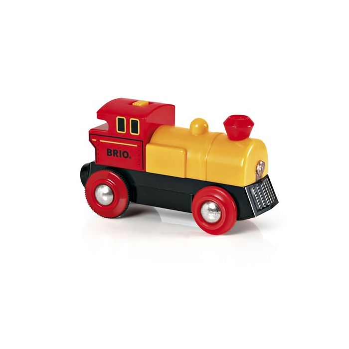 Steam up with this red, classic BRIO two way battery powered engine. The forward and reverse functions as well as headlights that light up make this a fun companion on the railway.