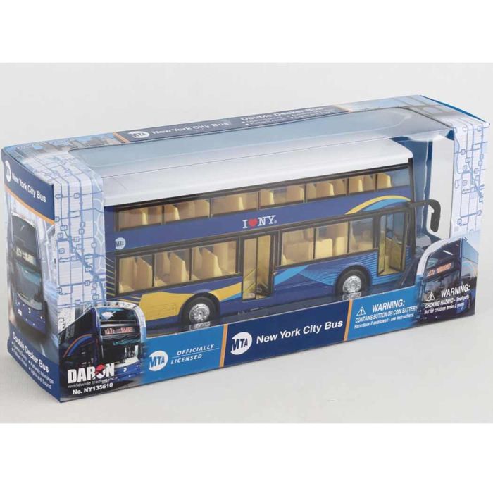 This Double Decker Bus is certified by the New York MTA. It comes with functional lights and sounds. Doors open and close! Fun for children as you pull back the bus and watch it take off.