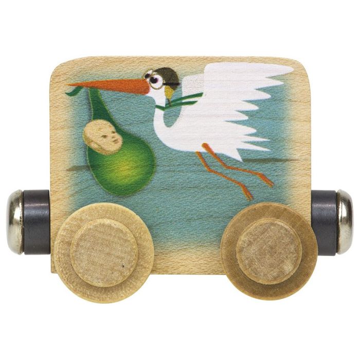 Welcome to the world! The NameTrains Stork Car is crafted from local sustainably harvested native maple hardwood and is compatible with most wooden railway systems. Measures approximately 2.7" long by 2" high. Strong magnets allow you to attach to your name or make a special train. Non-toxic finish and ink; printed on both sides.