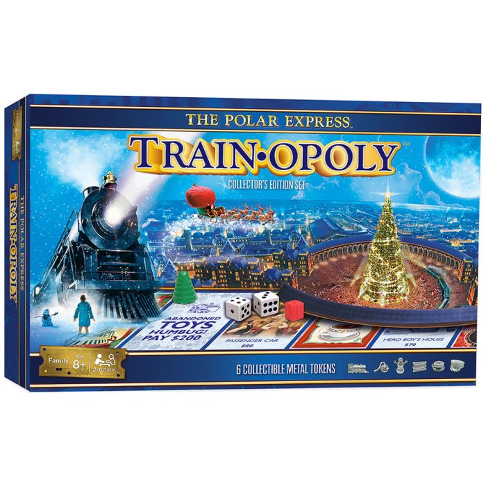 Take a ride on the Polar Express with this MasterPieces Opoly Board Game! Experience Christmas Eve at any time, as you revisit characters and places from the movie. Discover not only movie trivia, but also many memorable quotes to be found on each property card! 2-6 players ages 8+ can take this festive trip! Each product comes with a Game Board, 6 Collectible Metal Tokens, 22 Movie Property Cards, 4 Ticket Cards, 2 Transportation Cards, 16 Spirit of Christmas Cards, 16 Hot Chocolate Cards, 1 Pack of Custom Money, 32 Plastic Gift Markers, 12 Plastic Christmas Tree Markers, 2 Dice, and Rules. For 2-6 players, ages 8+.