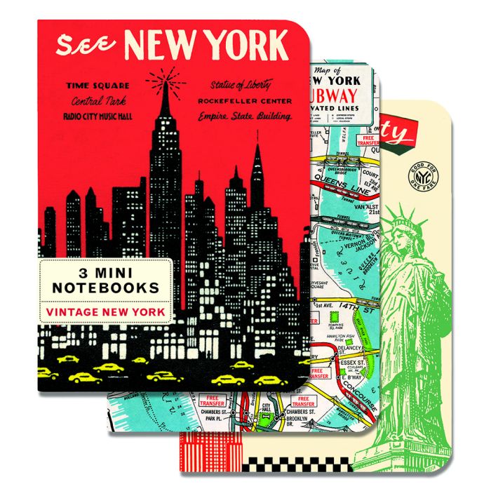 Three mini notebooks decorated with vintage New York images. Includes one ruled, one blank and one graph paper notebook (96 pages each). From Cavallini & Co.