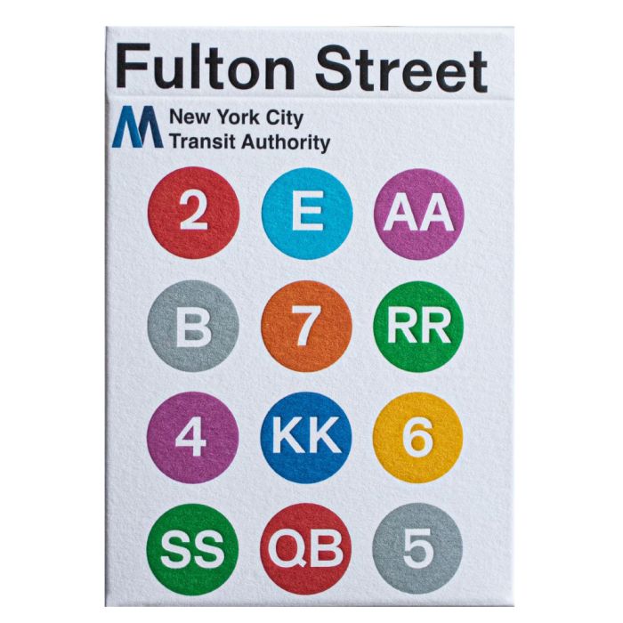 No expense was spared in creating these classic playing cards that feature completely custom back and face card designs that celebrate the now legendary signage of the most frequented transit system in the USA.
