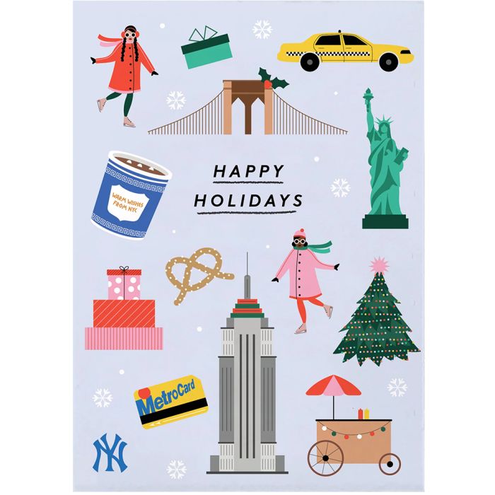 Happy Holidays from NYC is a festive holiday card featuring NYC icons including Chrysler Building, Statue of Liberty.