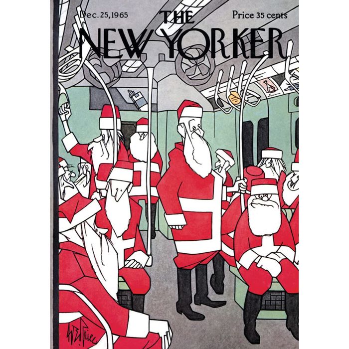 Single card featuring Subway Santas cover of New Yorker magazine. Beautifully illustrated. Perfect for holiday card mailing.