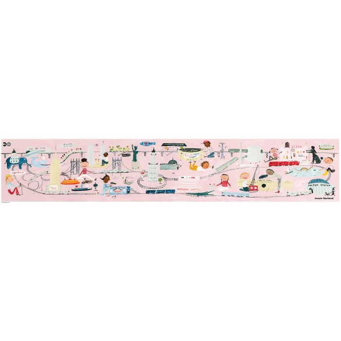 Writer and illustrator Jessie Hartland recently curated a Dollhouse Show and was inspired by the the microcosm of miniature worlds. For her MTA commission, Hartland wanted to capture memories of childhood play and includes historic New York City architectural landmarks and some beloved gems from the past, notably the old Penn Station, Klein’s Department store and the World Trade Center featuring the high-wire by aerialist Philippe Petit.