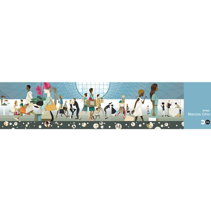In "Fulton Center, Beneath the Beautiful Blue," illustrator Marcos Chin depicts a series of chic and stylish New Yorkers traveling through the new multi-layered lower Manhattan transportation hub Fulton Center. Marcos’ work is crowned with a depiction of the stunning "Sky Reflector Net" a work commissioned by MTA Arts & Design and a collaboration by James Carpenter Design Associates, Grimshaw Architects and Arup. Marcos’ work can be seen in subway stations and buses throughout 2015.