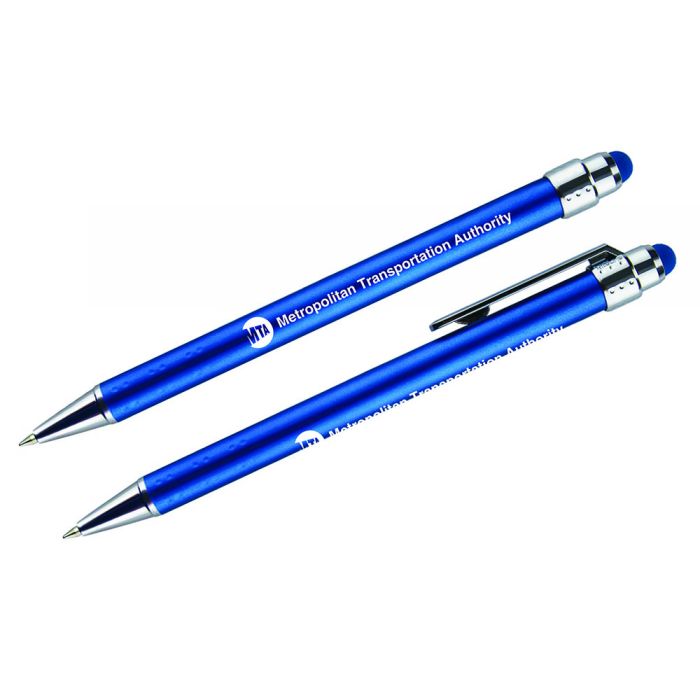 MTA - Metropolitan Transportation Authority ballpoint pen with stylus. This pen features a metallic barrel with satin finish and stylus, has medium point, and super smooth writing. Slide down the clip to use the pen - slide the clip down again to retract. Black writing ink. Measures 6" L x 0.5" W x 0.6" H