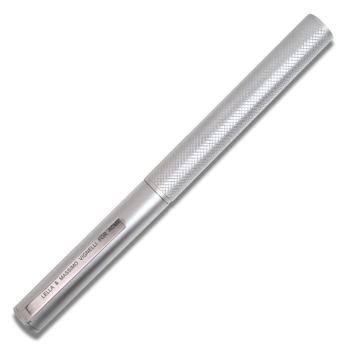 "Zigrinato", meaning knurled in Italian, as the barrel of the pen in indeed knurled with an all brushed metal cap. It is a Limited Edition roller ball pen. "LELLA & MASSIMO VIGNELLI FOR ACME" is laser engraved on the clip. The edition number is placed on the top of the cap. Only 500 pens of this design were made. No more will ever be produced.