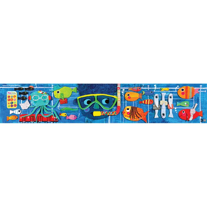 Redbird Reef by Vanessa Brantley-Newton depicts an underwater adventure. The imaginary commute includes a boy surrounded by a variety of colorful fish, an octopus and a toy redbird subway car to playfully referencing the past. Some of the sea creatures are wearing hats, carrying briefcases, listening to music or holding reading material. The fun-filled scenes were inspired by Vanessa's memories and imagination.