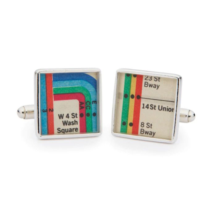 These cuff links are crafted from authentic Vignelli diagrams of the New York City subway from 1972-78. Iconic neighborhoods and locations are featured. Each map piece is set in a sterling silver bezel with a swivel finding and protected with mineral glass. Back hallmarked "NYCT." Measures approximately 5/8" square. Officially licensed by the MTA, each pair of cuff links comes gift-boxed with a Certificate of Authenticity.