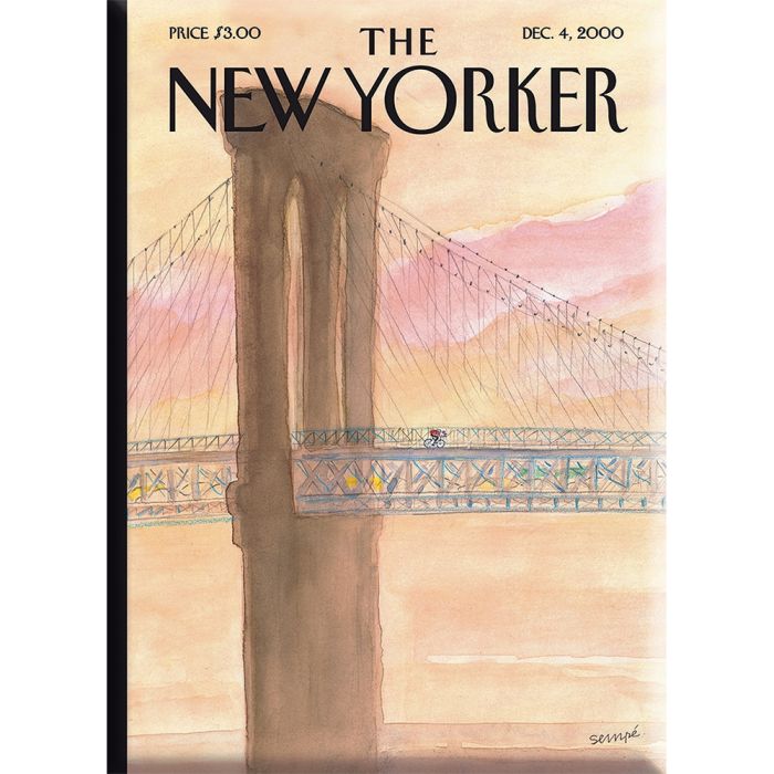 This New Yorker cover by Jean-Jacques Sempé titled Biking the Bridge shows the iconic Brooklyn Bridge with a determined cyclist heading towards the other side. Display this magnet as a reminder to you and others.