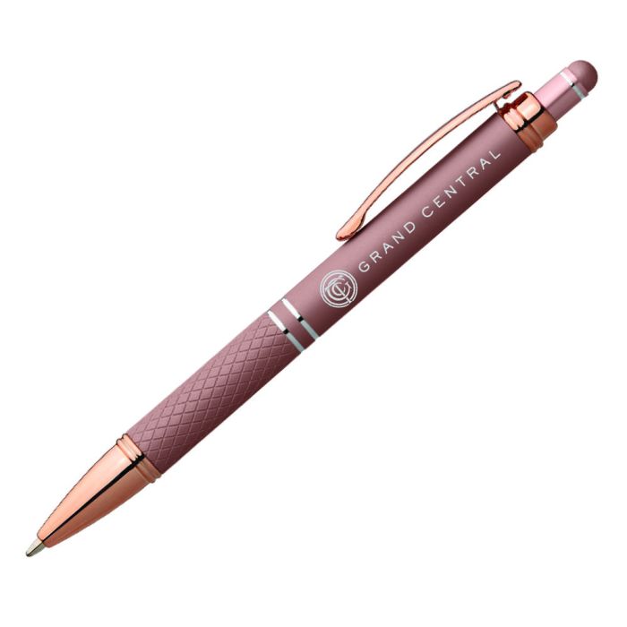 This rose gold metallic pen features luxurious soft-touch finish and diamond-textured grip. Stylish rose gold accents, trim and clip create a fashionable look. Laser engraved with GCT logo & Grand Central. Great for anyone visiting Grand Central Terminal in New York, working in midtown or fan of our great city. Jott down a note or send a text just as easily with the stylus tip.