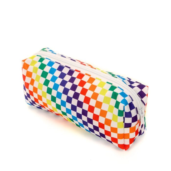 Stash all of your essentials in this rainbow colored indy checkered pencil pouch case, and move or commute on the go smoothly and in style. Goes great with our multi colored subway route items.