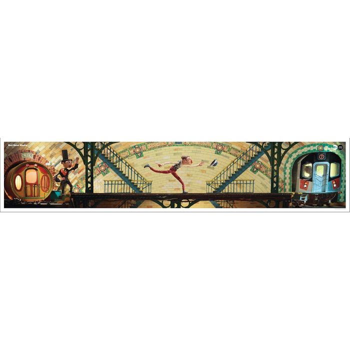 Red Nose Studio’s whimsical work, The Blowing Bowler, celebrates the evolutionary design of the subway car, starting with New York's first underground subway, the Beach Pneumatic Transit Company (1870) and stretching all the way through to the modern R-188 car design. A man chasing his bowler hat is part of the cat and mouse relationship between the continually evolving, non-stop motion of the subway system and the bustling crowds who are always heading to catch the next train to move them forward.