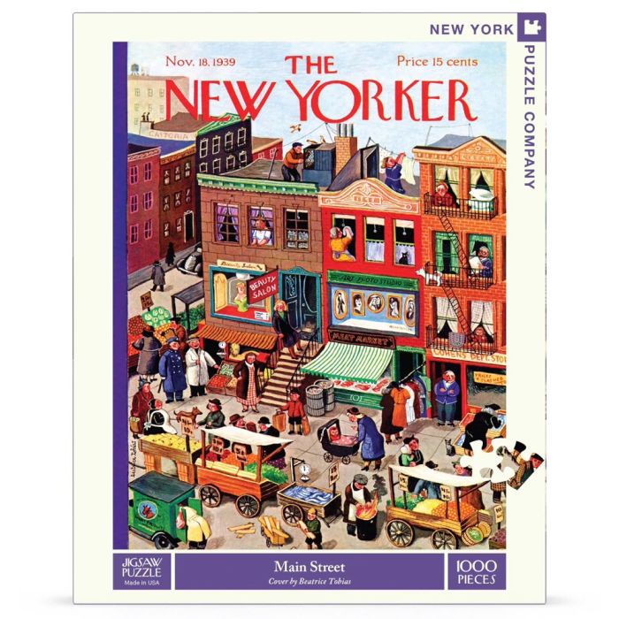 Step back in time to the vibrant bustle of 1930s New York with Main Street, a stunning 1000-piece jigsaw puzzle showcasing the vivid cover artwork from the November 18, 1939, issue of The New Yorker. This beautifully detailed scene captures the lively energy of a city street, featuring a row of charming shops, bakeries, and bustling storefronts with cozy apartments above. Wagons line the curb, overflowing with fresh fruits, vegetables, and goods for sale, bringing the city’s daily hustle to life in rich, vivid colors. Perfect for puzzle enthusiasts and history lovers alike, Main Street is a delightful journey into the past, allowing you to experience the heart of New York City in the late 1930s, one carefully crafted piece at a time.
