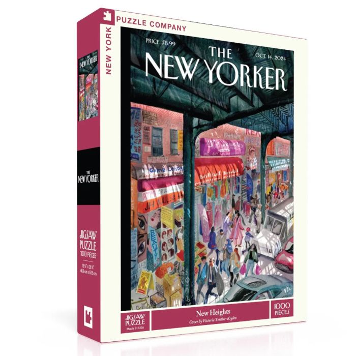 Bring the energy of the city to your tabletop with New Heights, a vibrant 1000-piece jigsaw puzzle featuring artwork from the October 14, 2024 cover of The New Yorker. Illustrated by Victoria Tentler-Krylov, this dynamic scene captures the hustle and bustle of a colorful urban neighborhood beneath towering elevated tracks. Street vendors, fashionably dressed pedestrians, and eclectic storefronts come together in a celebration of community, culture, and upward momentum.