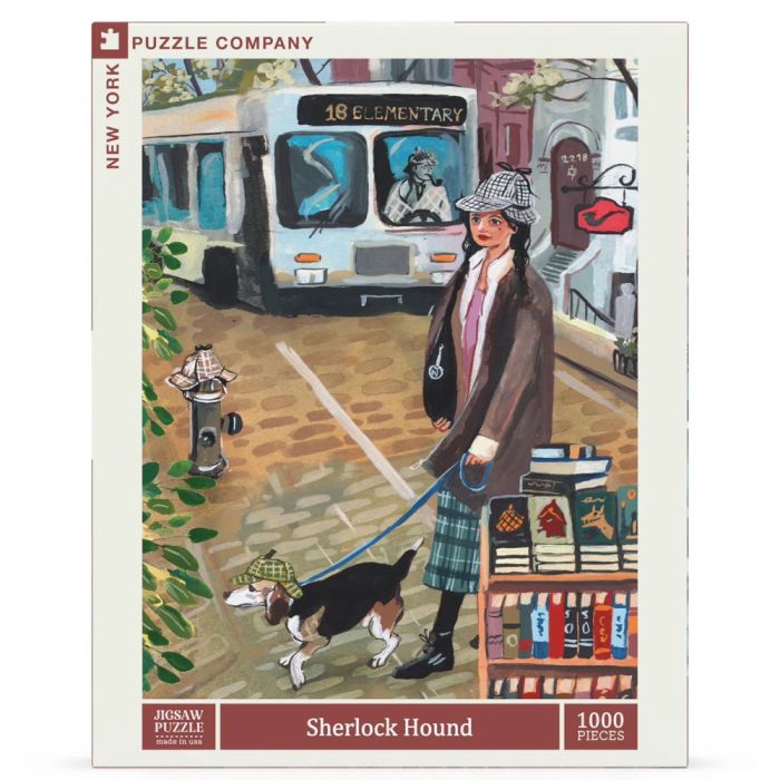 Step into the world of intrigue with the Sherlock Hound 1000 Piece Jigsaw Puzzle, beautifully illustrated by renowned artist Jenny Kroik. This captivating puzzle combines charm, mystery, and the joy of discovery. The artwork features a young woman strolling with her loyal beagle, both dressed in classic Sherlock Holmes-style caps. The scene is bursting with hidden clues and clever details, from pipes to a display of intriguing books at a sidewalk shop. Look closely—there are even more caps and subtle hints waiting to be uncovered!