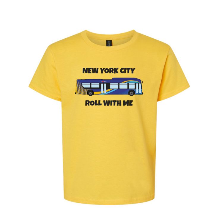 Kids bright yellow MTA Bus shirt with words "new York City", "Roll With Me".