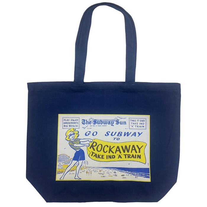 Whether you're heading to the beach or navigating your daily commute, this Rockaway Beach tote bag is perfect for carrying all your essentials. Inspired by the iconic Rockaway Beach Subway Sun Ad, this tote bag features a stylish and nostalgic design.