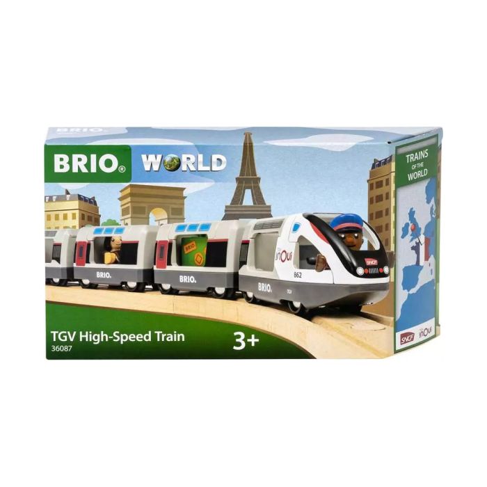 Travel from romantic Paris to the French Riviera on board the 36087 TGV High-Speed Train – part of the Trains of the World series. This high-speed train comes with an accurate TGV design and is the longest train in BRIO World with space for 6 characters. The TGV railway covers much of France but also connects to many neighbouring countries such as Italy, Spain and Germany. Explore iconic railway routes and famous trains from all around the world with the Trains of World series.