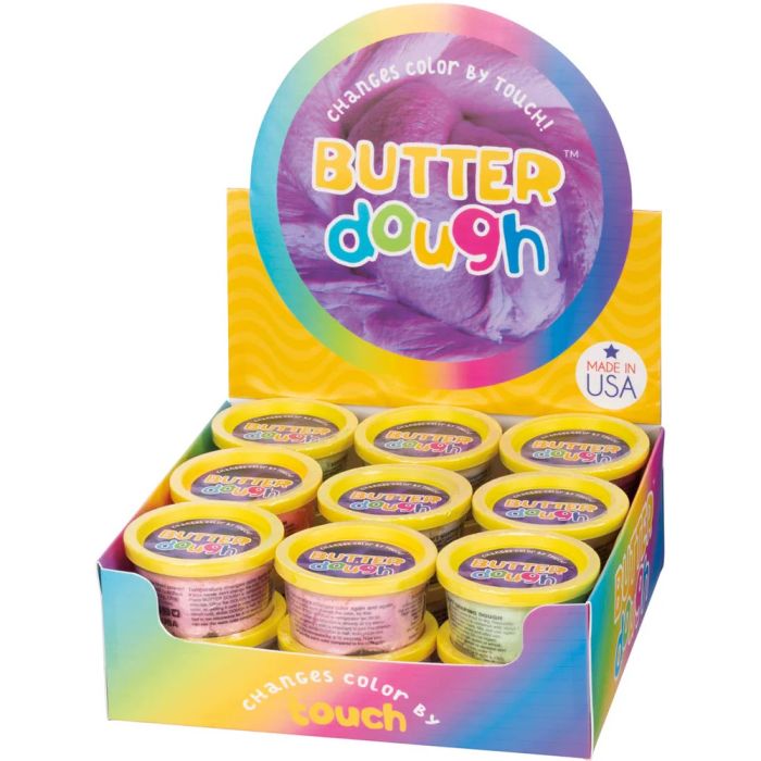 Butter Dough is a color-changing, smooth, and stretchy putty toy. Each putty is 3.75 ounces and fits neatly inside its reusable plastic container. Assorted colors available and temperature sensitive. Putty changes colors when exposed to heat or cold. Made of buttery-soft material, its fluffy texture and color-shifting capabilities provide positive sensory experiences both via touch and sight. Butter Dough inspires little artists to imagine and create. Usable as a fidget toy to possibly help kids reduce stress and anxiety or improve focus and concentration. Use at home, in school, and on the go.
