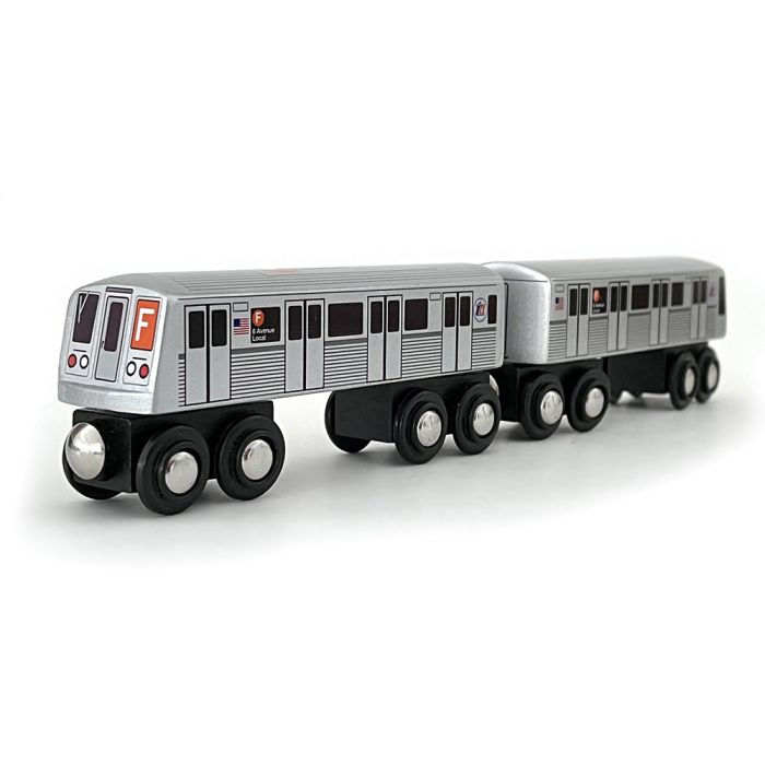 Replica MTA F Train Slant End R40 Wooden Toy 2 Car Set. Add this captivating addition to any young railway enthusiast's collection. This meticulously crafted wooden toy subway train captures the iconic design of the MTA F Train, inspiring imaginative play and exploration.