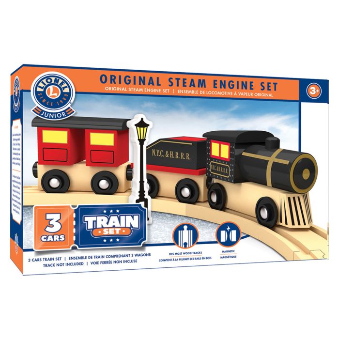 This MasterPieces Lionel Junior Original Steam Engine Set 3-car wooden toy train includes a steam engine, tender, tunnel locomotive, and a bonus vintage lamppost! This magnetic Lionel train set is compatible with most 1" wooden train tracks (track not included), and is the perfect gift for all kids, ages 3 and up! Lionel wood trains capture all the vintage details of classic Lionel history. These trains are perfect for introducing the next generation of train lovers to timeless Lionel designs.