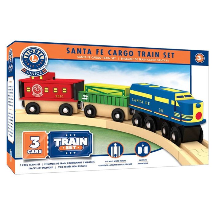 This MasterPieces Santa Fe Wooden Train Set includes 3 Train Cars,the Santa Fe Diesel Engine, the Cargo Car with Removable Milk & a Caboose. This magnetic Lionel train set is compatible with most 1" wooden train tracks (track not included), and is the perfect gift for all kids, ages 3 and up! Lionel wood trains capture all the vintage details of classic Lionel history. These trains are perfect for introducing the next generation of train lovers to timeless Lionel designs.