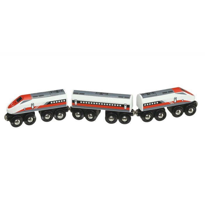 This Bullet Train set will be sure to put a smile on any little train engineer in the making. Nicely painted with a modern design, this finely crafted wooden train will entertain for hours on end. This train is also compatible with all major wooden railway systems and is manufactured using the highest quality wood as well as the highest safety stands in the industry.