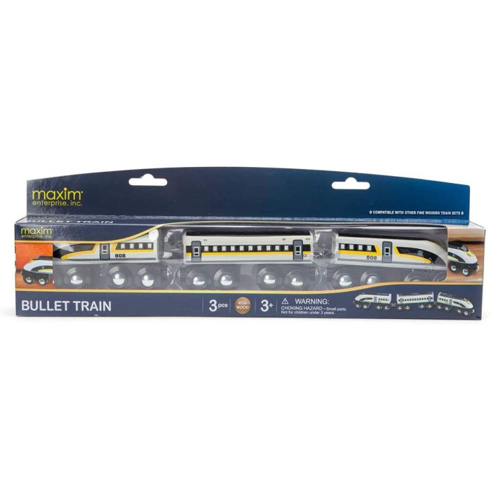 This Bullet Train set will be sure to put a smile on any little train engineer in the making. Nicely painted with a modern design, this finely crafted wooden train will entertain for hours on end. This train is also compatible with all major wooden railway systems and is manufactured using the highest quality wood as well as the highest safety stands in the industry.