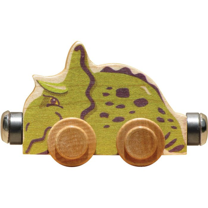Beware, T-Rex, this dinosaur's on wheels! Spike the Triceratops is crafted from local sustainably harvested native maple hardwood and is compatible with most wooden railway systems. Measures approximately 3.2" by 1.9" high. Strong magnets allow you to attach to your name or make a special train. Non-toxic finish.