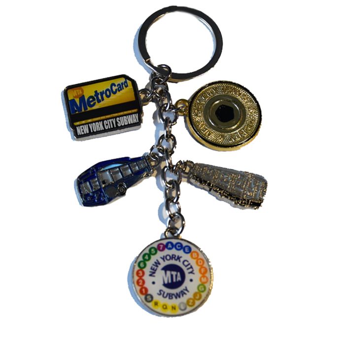 Multiroute dangle keychain with replica blue New York Bus, silver New York Train, Five Boro token and MetroCard