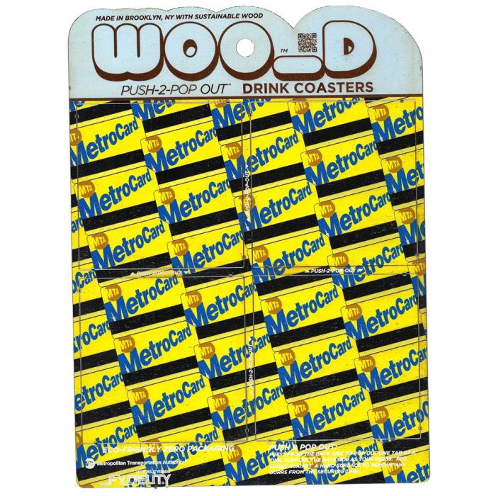 Four Wood Coasters featuring the iconic MetroCard, a symbol of transit in New York City.