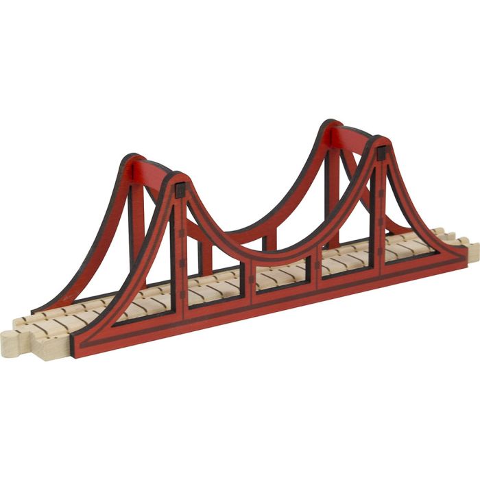 Beautiful red bridge can lay flat on the track table or it can span a distance when used in conjunction with bridge set track. Our Suspension Bridge measures 12.7" long by 3.7" tall, constructed of high quality birch plywood sides affixed to a 12" piece of track. 2.6" tall bridge opening is high enough to accommodate our NameTrains letters. Compatible with our and other wooden train sets.